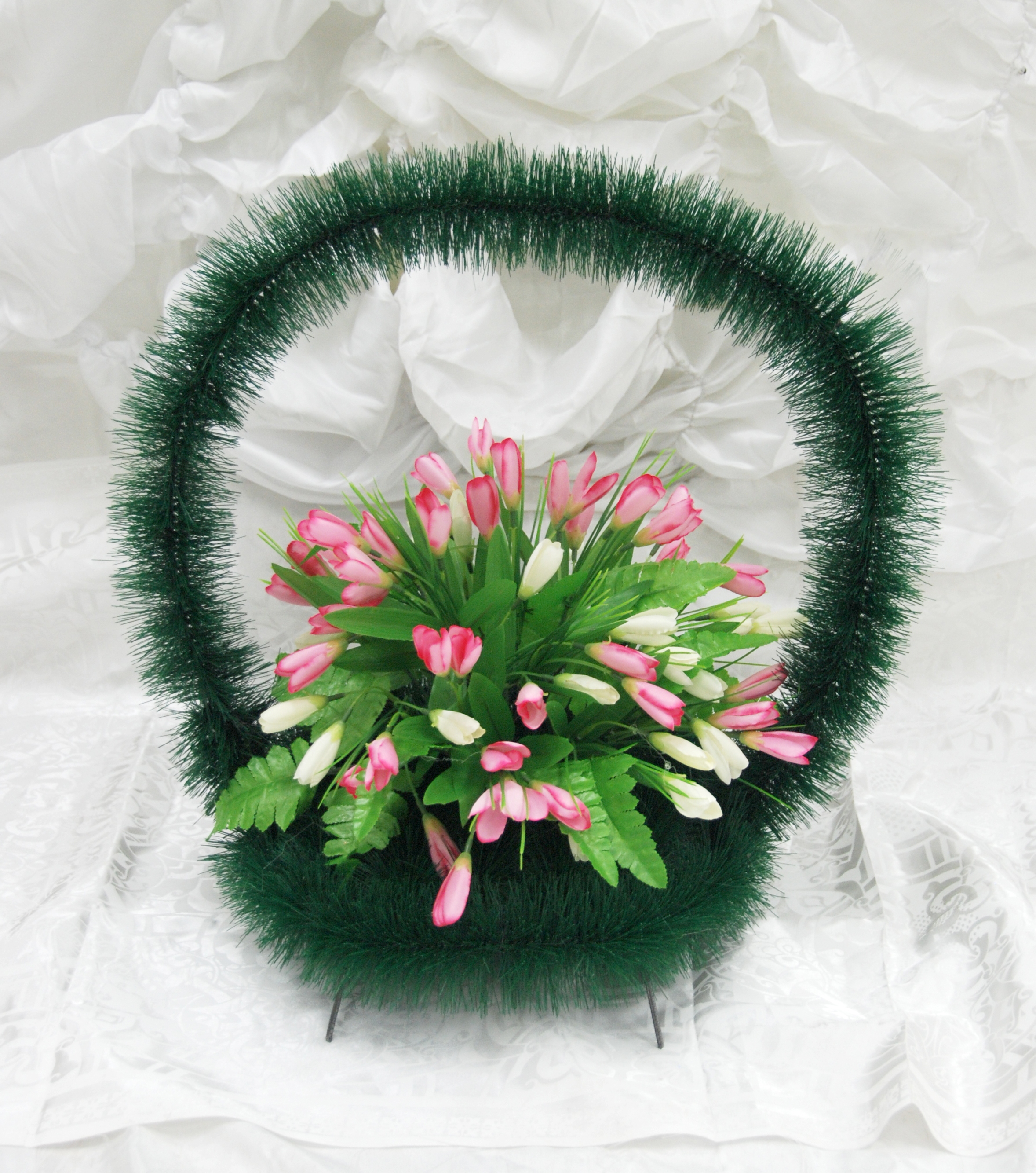 МатериалМеталлический каркас, ерш ритуальный, искусственные цветы.